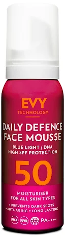 Ett dagligt skydd mot UV och HEV strålning. En intensivt återfuktande anti-age ansiktsmousse som förstärker hudens skyddsbarriär och förebygger tidiga ålderstecken och pigmentfläckar Den allergitestade formulan lämpar sig för alla hudtyper, även mycket känslig. Formulan används med fördel under make-up, då den även skyddar mot smink som eventuellt kan irritera huden. EVY Daily UV Face Mousse fungerar utmärkt ensam, men även över din ordinarie hudvård. Innehåller mycket högt UVA-skydd i förhållande till UVB-skyddet. Maximalt antal stjärnor enligt Boots Star Rating och PA-test. Lämplig för veganer. Innehåller ej konserveringsmedel eftersom aerosolflaskan inte öppnas. Parfymfri.